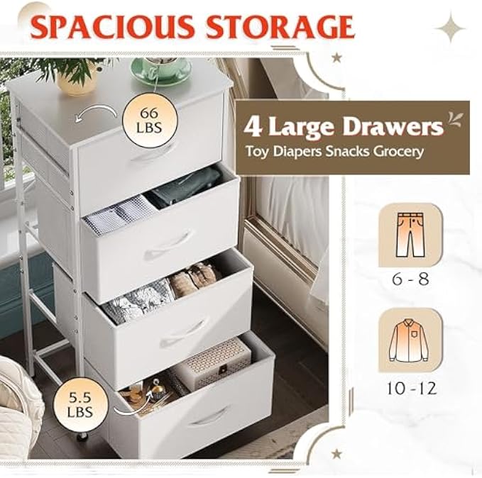 MULTIFUNCTION DRESSER: This vertical closet dresser matches perfectly with other WLIVE storage towers; This storage dresser is great for closets, bedrooms, playrooms, entryways and more SUFFICIENT STORAGE SPACE:WLIVE 4 dresser drawers are great for organizing your clothes, blankets, scarves, socks and other accessories; Wood top provides hard surface for displaying lamps, clocks, books, glasses etc. STURDY STRUCTURE: Strong steel frame and water-resistant wood top offer stable support and ensure years of use; High-quality non-woven fabric drawers is easy to clean 4 Closet Drawers: Features 4 removable foldable drawers; Easy pull handle helps open and close the drawers simply; 4 adjustable plastic feet protect your floor from scratches EASY ASSEMBLY: This chest of drawers is easy to assemble with hardware included; Overall dimension: 15.7" L*11.8" W*38.7" H
