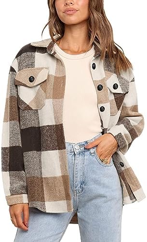 Material: Made of high quality 100% Polyester fabric, skin-friendly, soft and comfortable to wear, will keep your warm and fashion style in fall,spring and cold winter Feature:It features soft fuzzy fabric, front button closure , and midweight feel for keeping warm all day. It'll be the prefect addition to your wardrobe.Two buttoned chest pockets / long sleeves with button cuffs / plaid pattern / loose fit shacket / collared.This shacket is a must have in your closet Match: You can pair this shirts with variety of tank tops, cami, bodysuit , jeans, denim shorts, jeggings, sneakers or boots to complete casual look that's easy to love all season long Occasion: Perfect for casual daily life,shopping, street wear, working, office, school,holiday, vacation, night out, outdoor etc,suitable for autumn, winter and spring Season:This flannel shacket jackets suits for spring,fall and winter,you can match it with everything you like to enjoy your life #1,217 in Clothing, Shoes & Jewelry ( ) #15 in